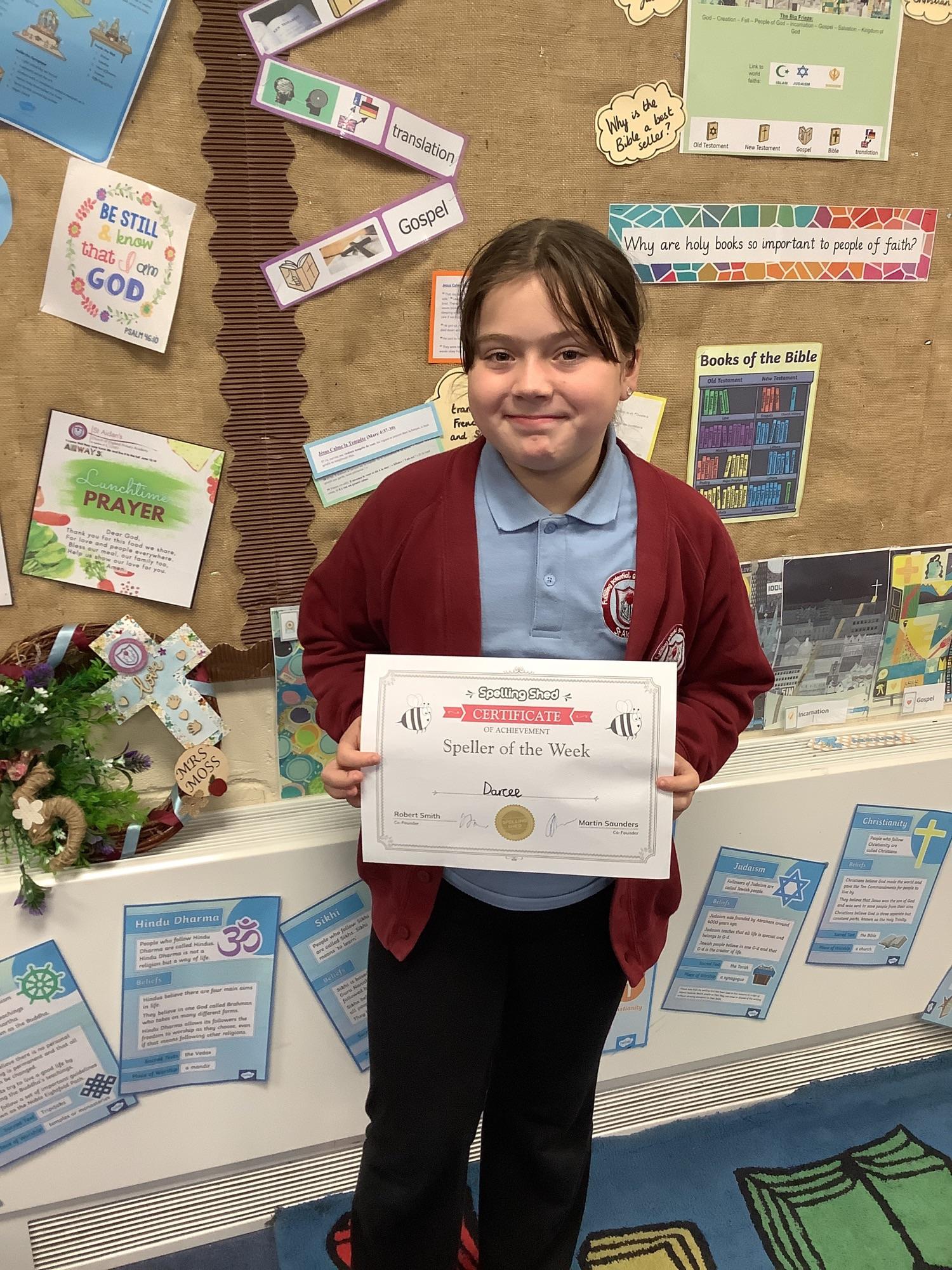 Darcee is this week’s speller of week. Well done Darcee!