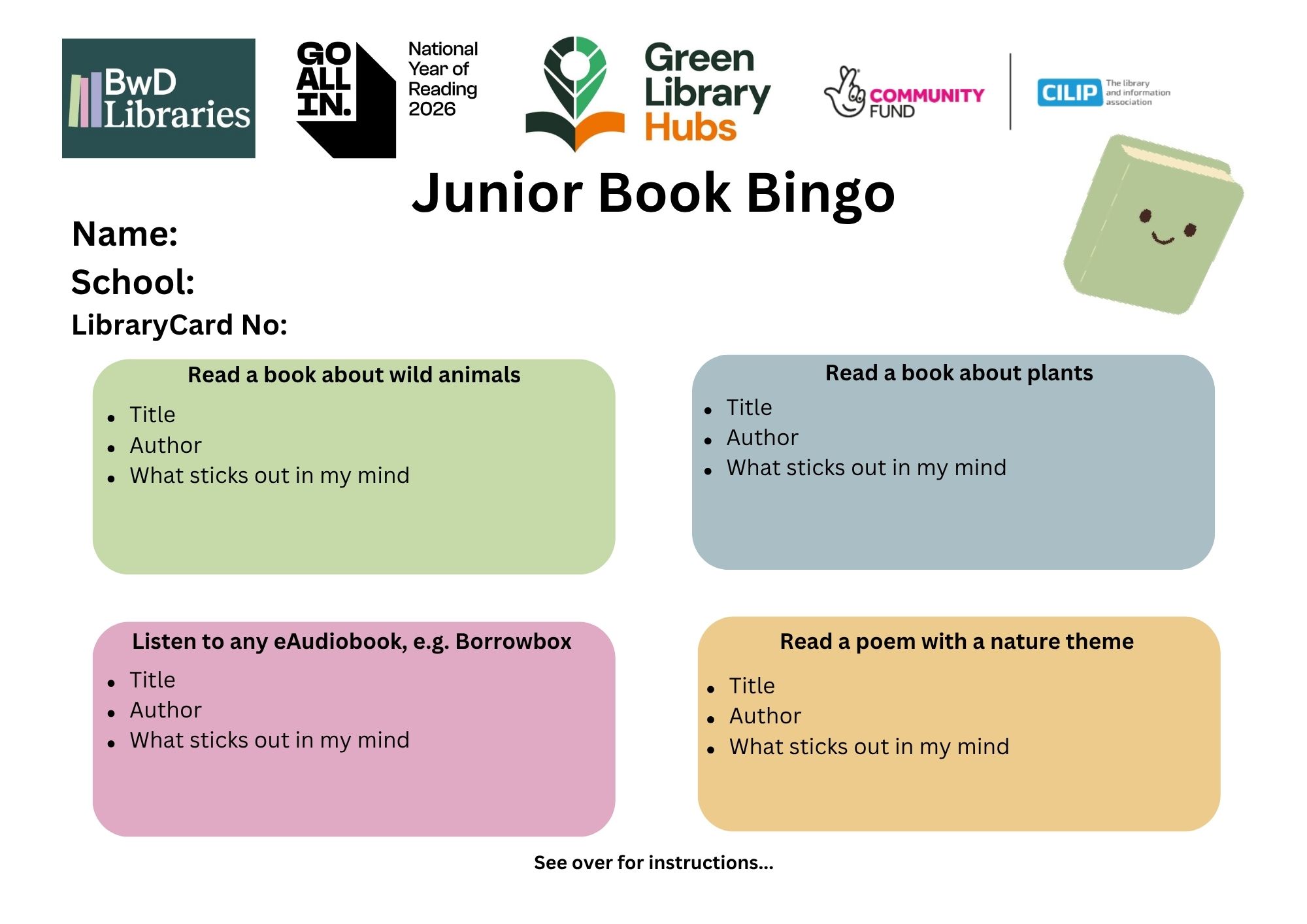 Junior Book Bingo 2026: Your Reading Adventure Starts Here! It's time to dive into the National Year of Reading! Use your library card to explore new worlds, complete your bingo card, and win some amazing prizes.