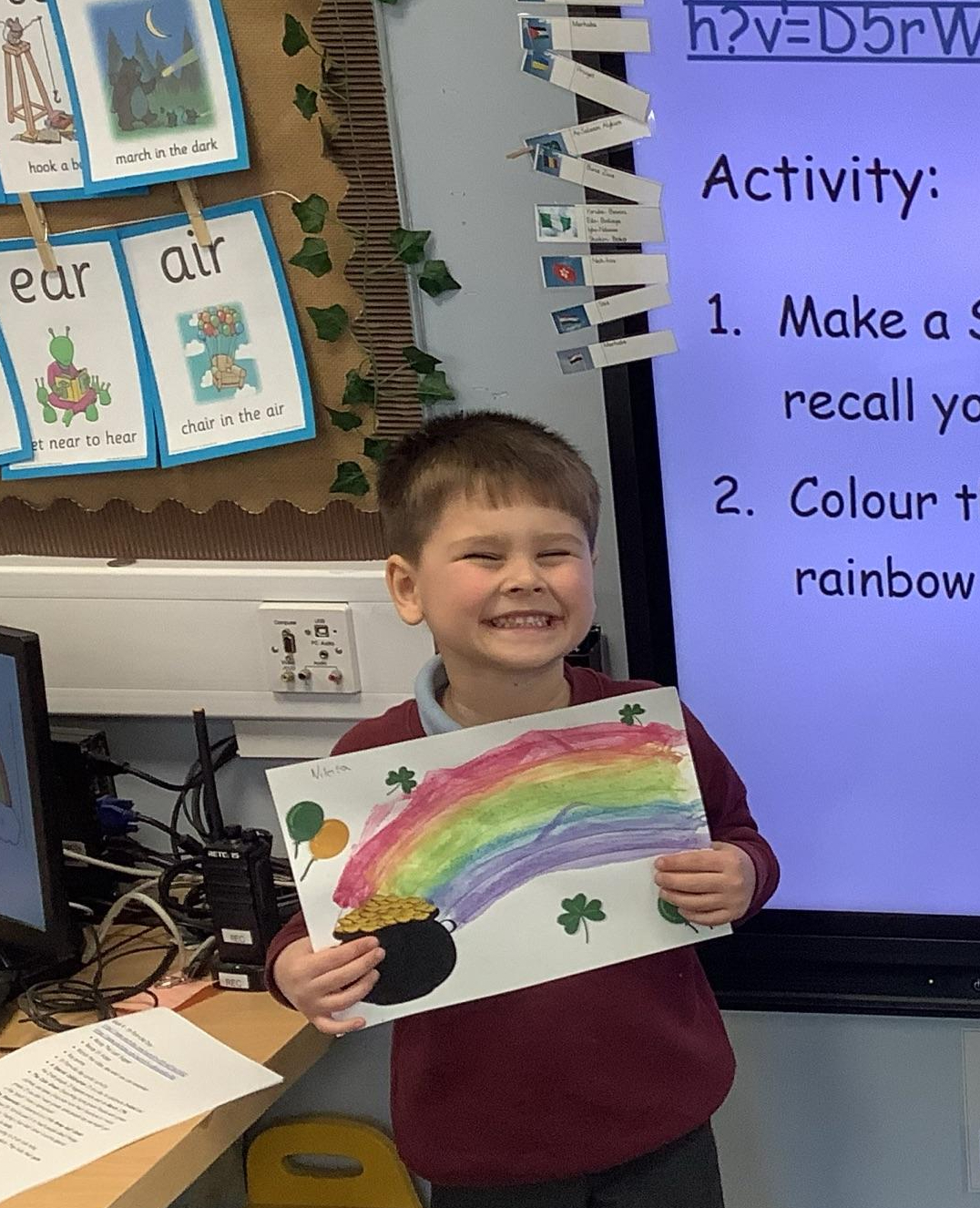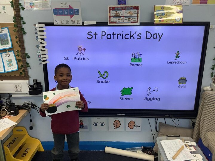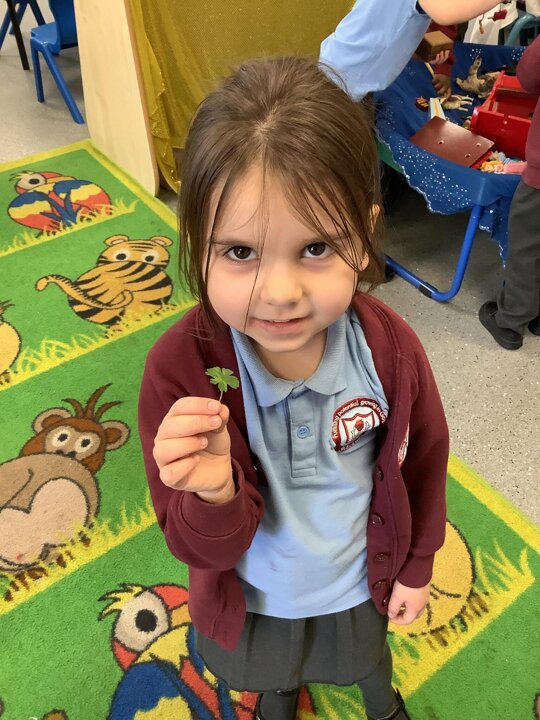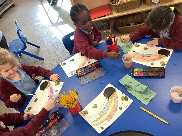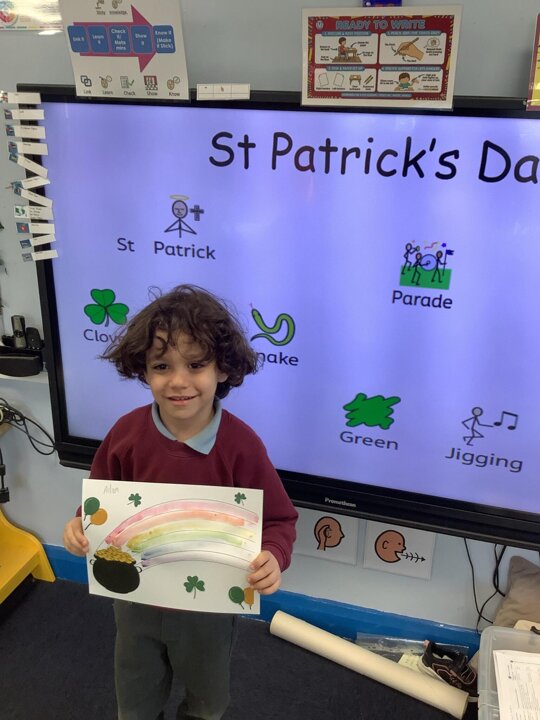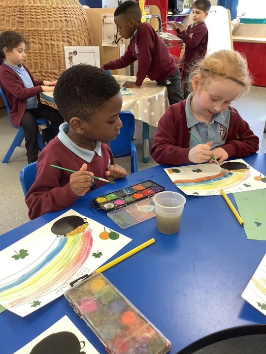 In RE/ UTW, Reception learnt about St Patrick’s Day, we painted some rainbows and found some shamrocks to represent the day!