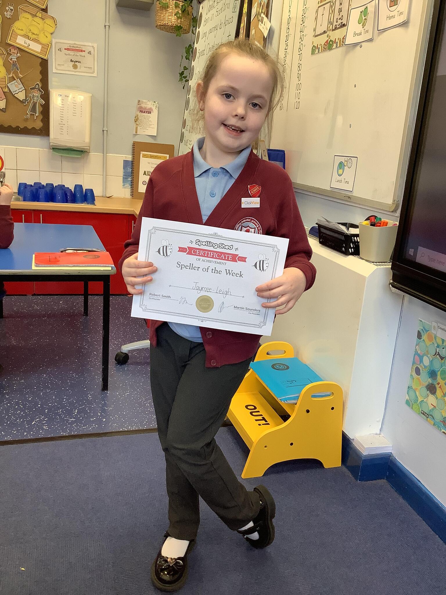 Jaymee-Leigh is this weeks speller of the week because she tries so hard and puts 100% into her home learning to ensure she achieves full marks.